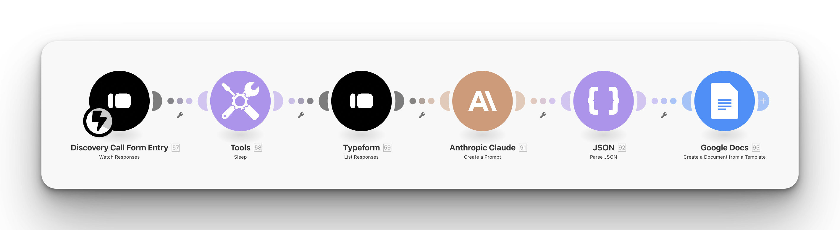 We built a fully automated proposal generation system that turns discovery call notes into professional, branded proposals in minutes. The entire workflow runs on autopilot using Make.com, Claude AI, and Google Docs.